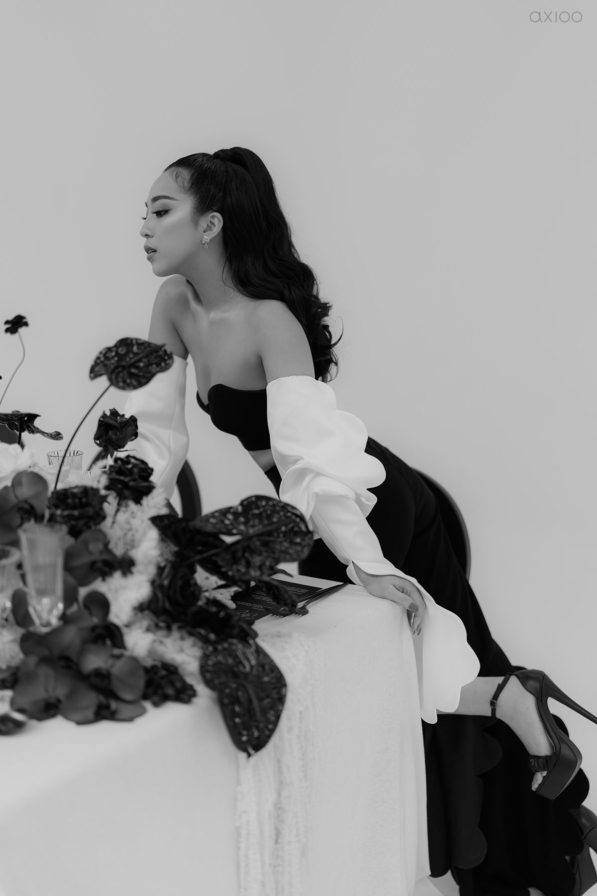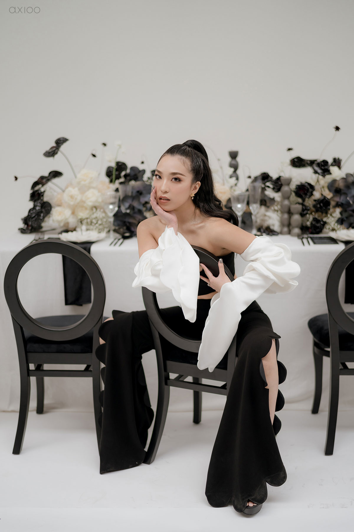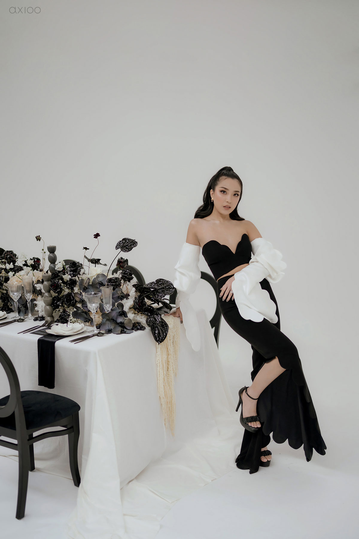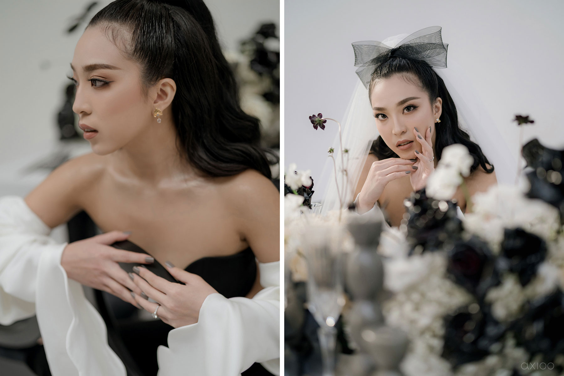 Special for the Bride Story Market, Axioo arranged a monochrome-styled shoot that showcased the elegant and minimalistic feel. Whether it’s white brick or a contrasting backdrop, the creative mixed and matched it with all-black vases, white lilies, and a plethora of other details that make our hearts skip a beat. Anyone who’s a fan of clean, sleek, crisp lines, and sharp contrast can trust the mood boards with us and let us make it come true!